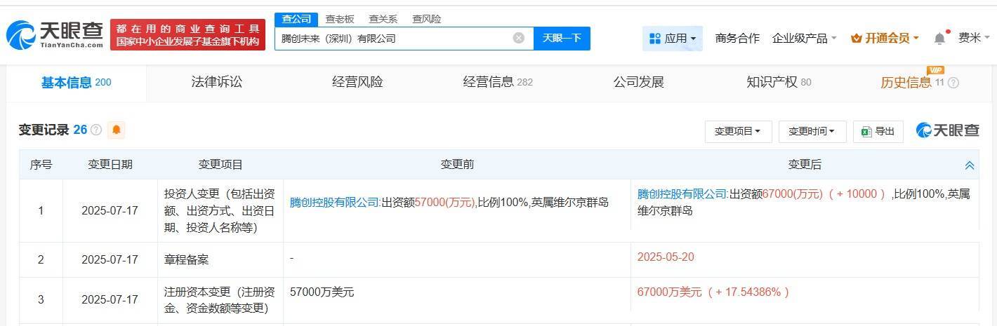 天眼查App显示,近日,腾创未来(深圳)有限公司发生工商变更,注册资本由5.7亿美元增至6.7亿美元。
