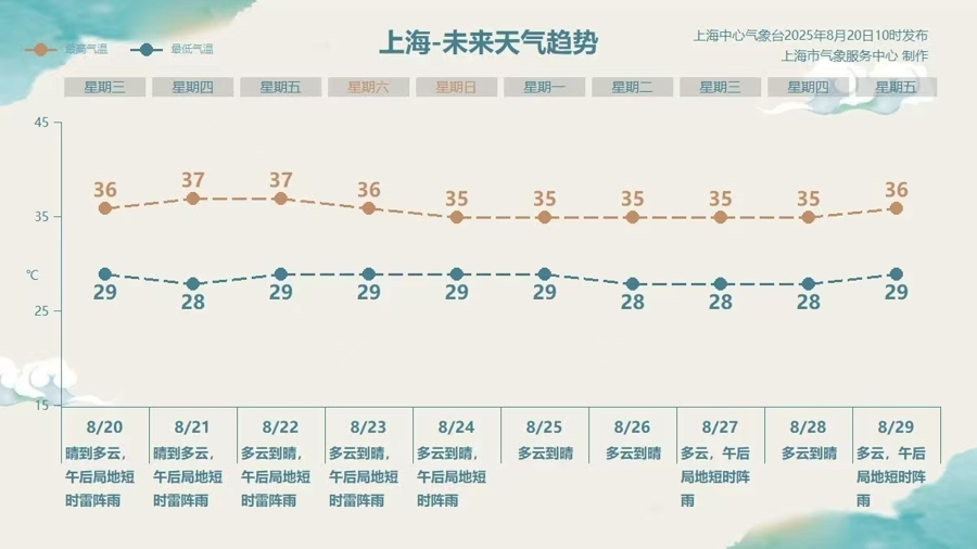 未来10天,上海仍在副热带高压的控制下,以多云或晴的天气为主,偶尔午后会出现热雷雨天气。降雨范围小、时间短,高温难解,请持续做好防暑降温工作。