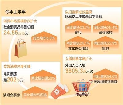 一是市场规模稳步扩大,消费主引擎作用更加凸显。据国家统计局数据,上半年社会消费品零售总额24.55万亿元,同比增长5.0%,增速比去年全年加快1.5个百分点。最终消费支出对GDP增长的贡献率达52%,充分发挥经济增长主引擎作用。分季度看,二季度社零总额同比增长5.4%,增速比一季度加快0.8个百分点。分消费类型看,上半年商品零售额同比增长5.1%,服务零售额增长5.3%。